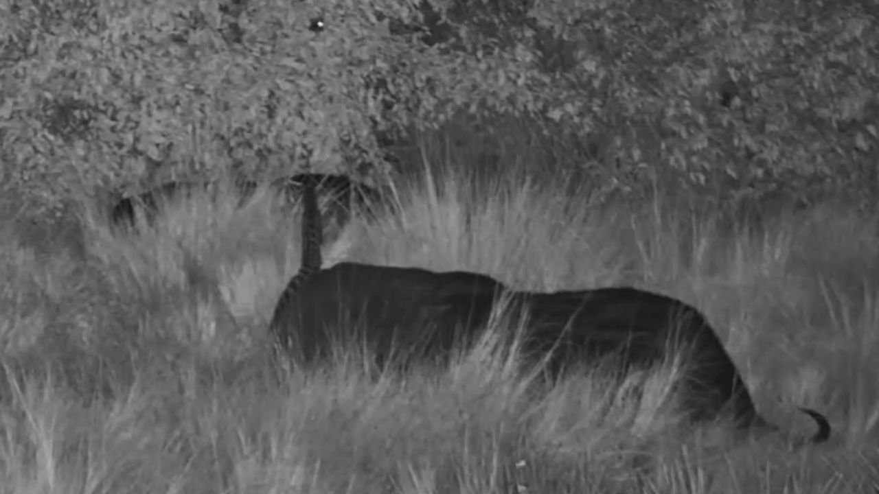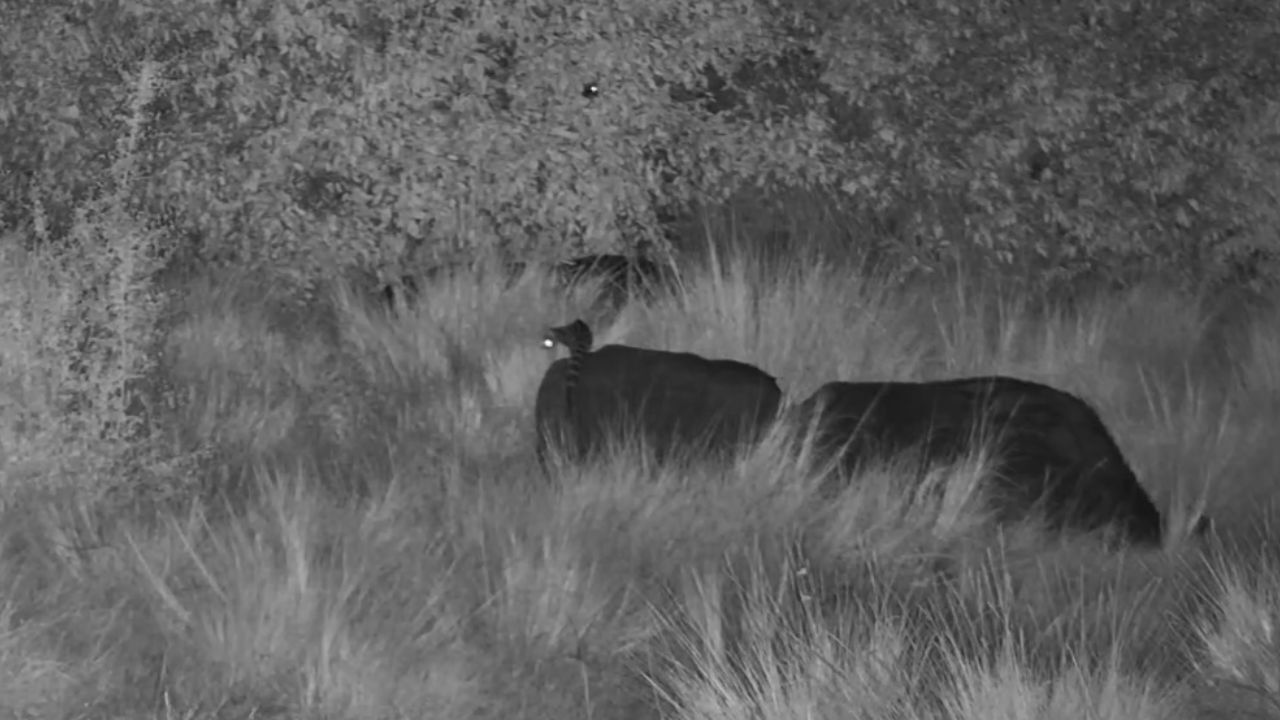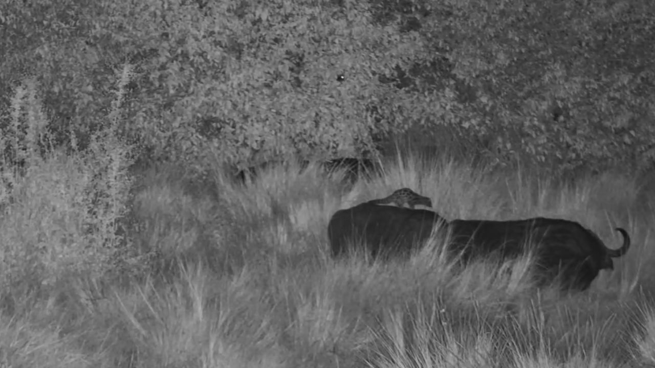 The encounter didn’t stop there. After a time, the genet launched from one buffalo to another, balancing deftly on its second host’s back. It walked the length of the animal, down its neck and even across its head before finally hopping off into the tall grass, disappearing into the night. Remarkably, the buffalo showed no signs of disturbance throughout the entire event – carrying on grazing as if nothing unusual was happening.